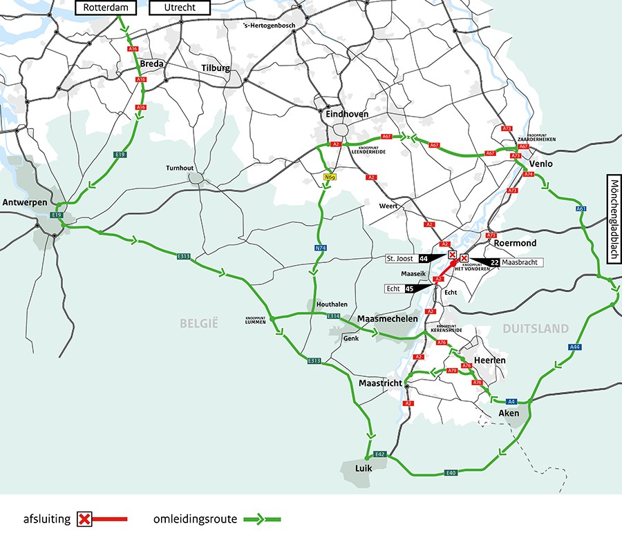- Verkeer vanuit het westen van het land wordt vanaf Breda omgeleid via Antwerpen (E19/E314).
