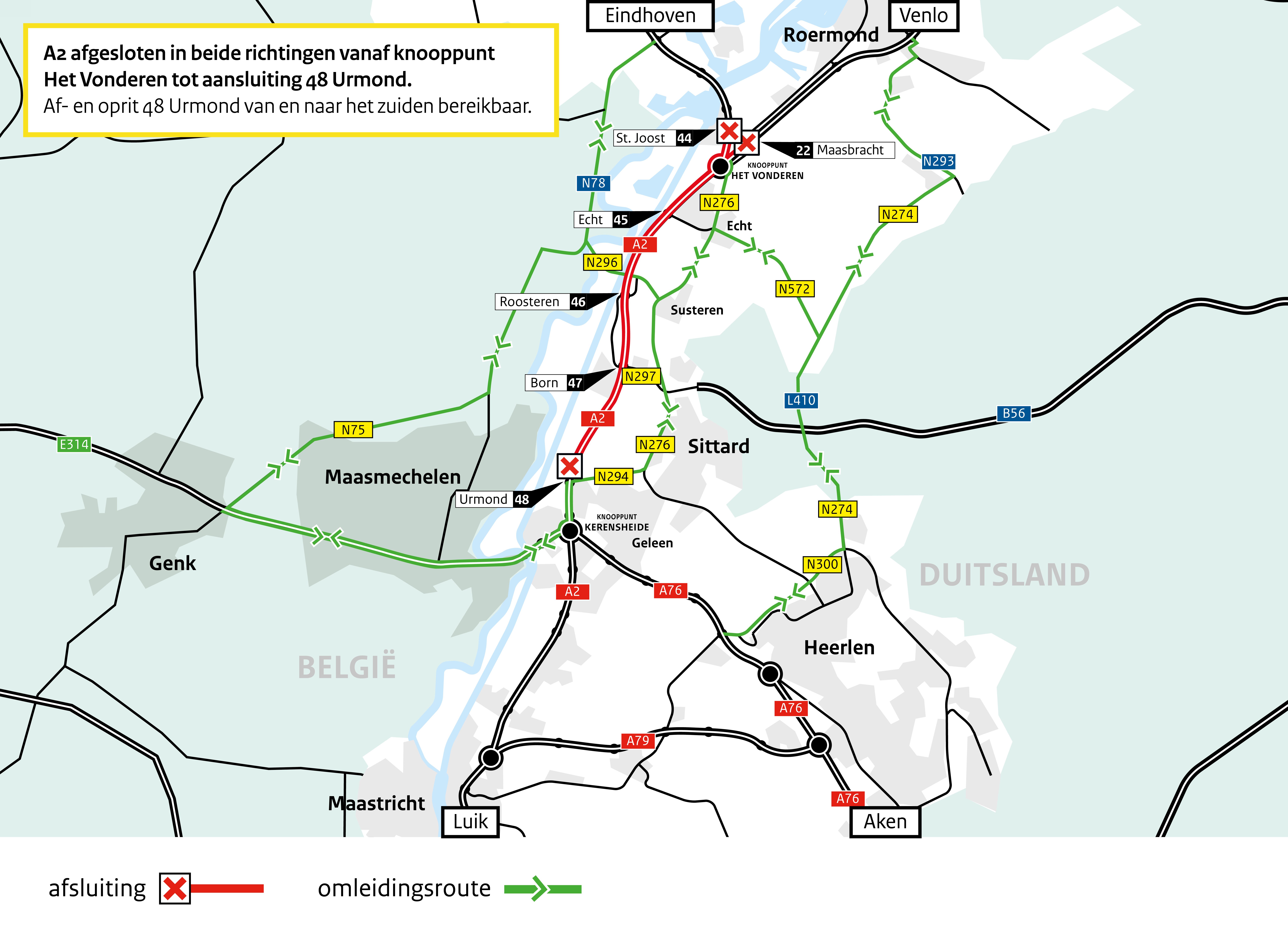 Moet je toch met de auto de weg op? Houd rekening met extra reistijd en volg de omleidingsroutes via de provinciale wegen N294 en N297, of wijs op de mogelijkheid om te rijden via België (via Genk, Maasmechelen en Maaseik). Een ander alternatief is de route via de N300, N274 en Duitsland (Selfkant) van en naar Roermond.